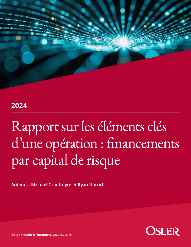 En 2022, Osler a publié la première édition annuelle de son Rapport sur les éléments clés d’une opération : financements par capital de risque, qui présente des données sur les opérations de financement par capital de risque et par capital de croissance sous forme d’actions privilégiées qu’il a réalisées. Contrairement à d’autres, notre rapport fournit sur les financements des données complètes qui dépassent les données du domaine public ou les données provenant de tiers.